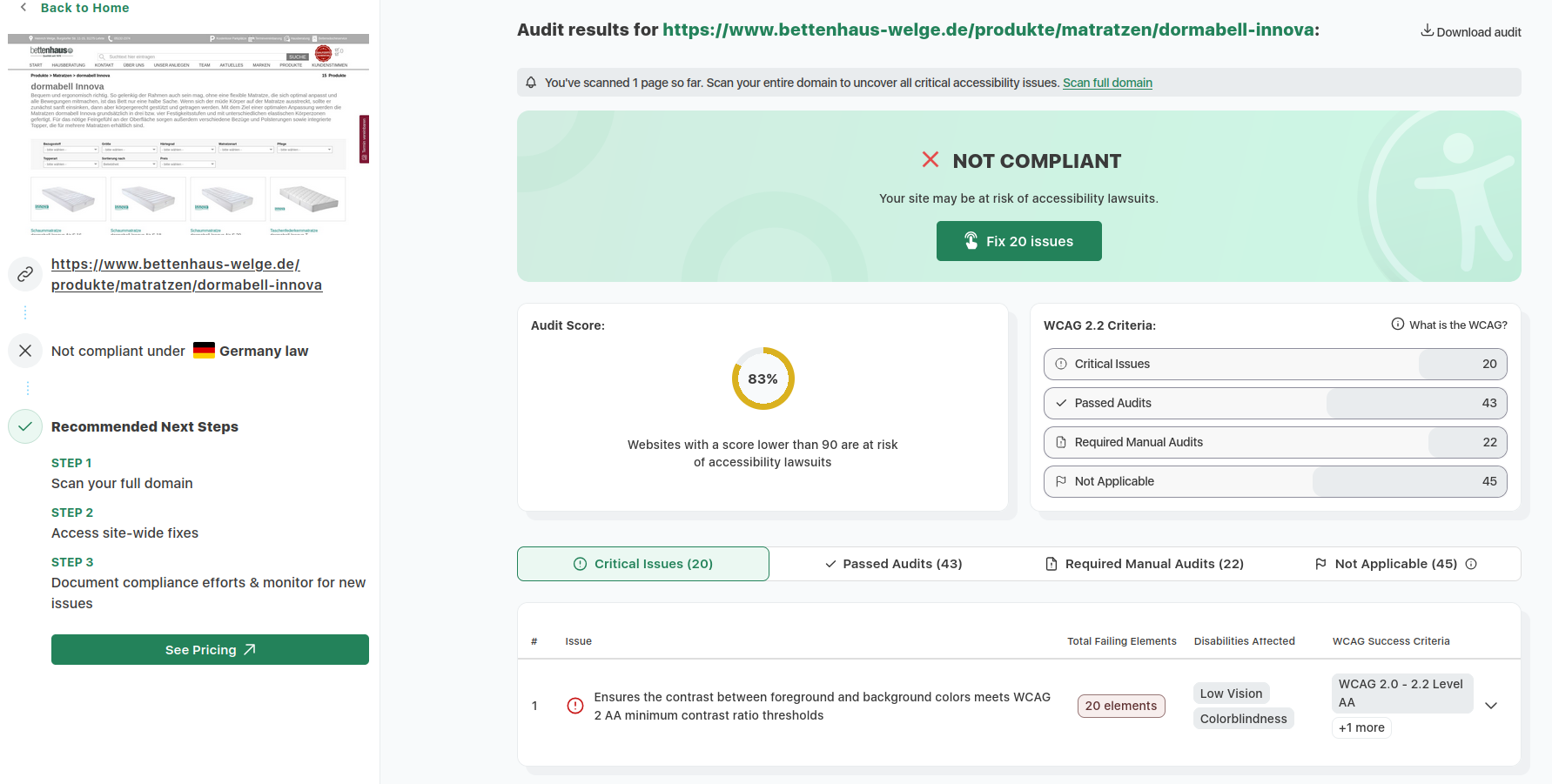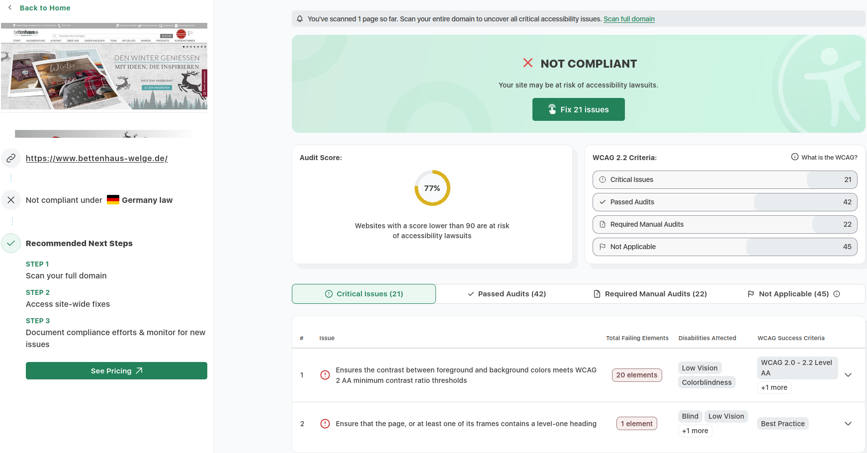 Zur Veranschaulichung unserer kontinuierlichen Überprüfungen der Barrierefreiheit haben wir Ergebnisse aus dem etablierten Tool accessibilitychecker.org dokumentiert. Diese Screenshots illustrieren exemplarisch identifizierte Barrieren sowie die erzielten Fortschritte. Im Folgenden finden Sie drei ausgewählte Screenshots solcher Prüfungen: